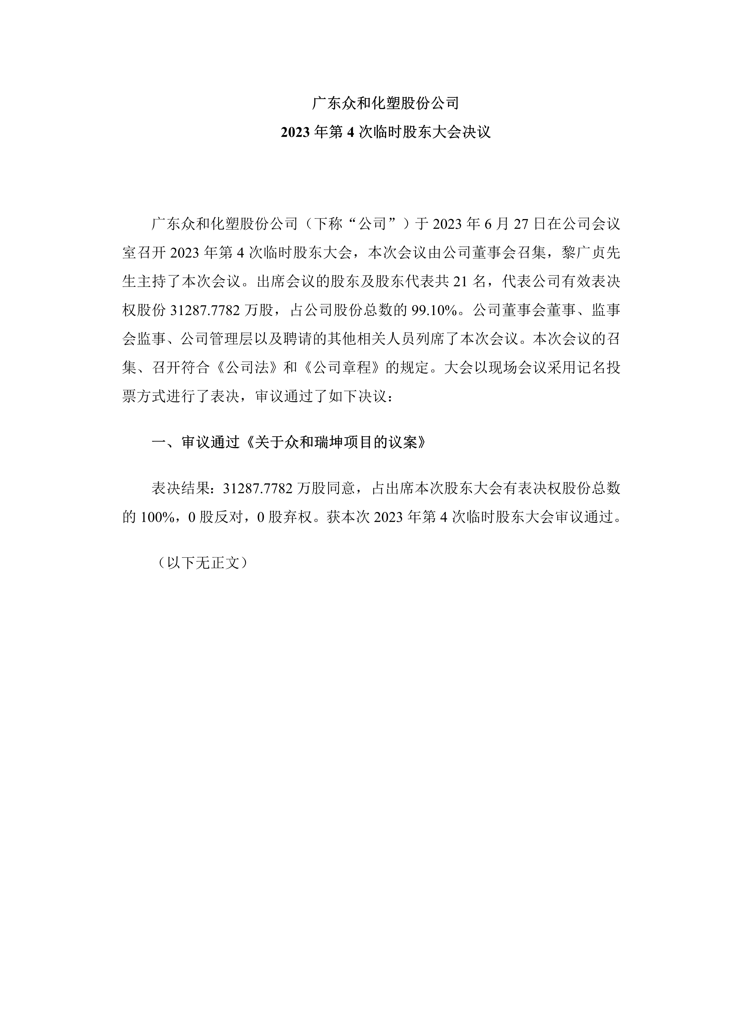 广东众和化塑股份公司(下称“公司”)于2023年6月27日在公司会议室召开2023年第4次临时股东大会